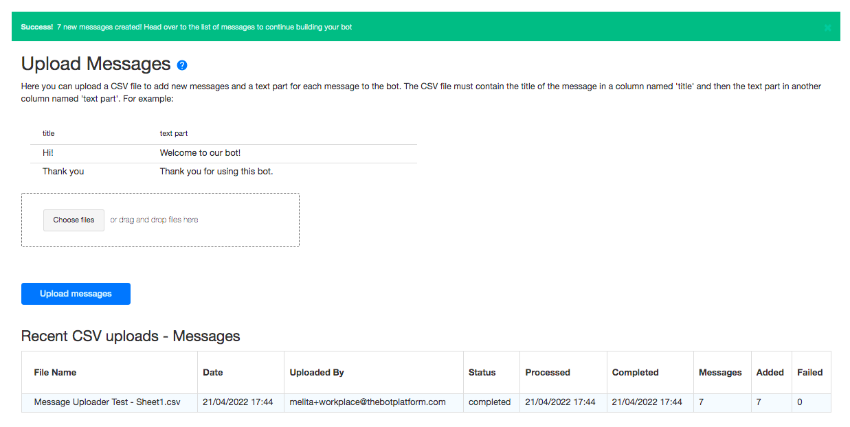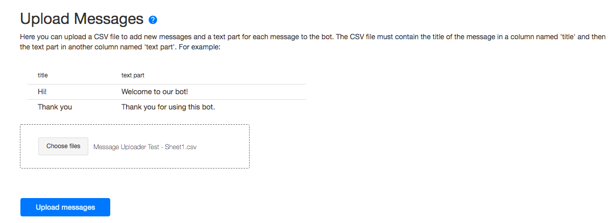 The message uploader allows you to upload of CSV of messages to your bot. You can upload a CSV file to add new messages and a text part for each message to the bot.