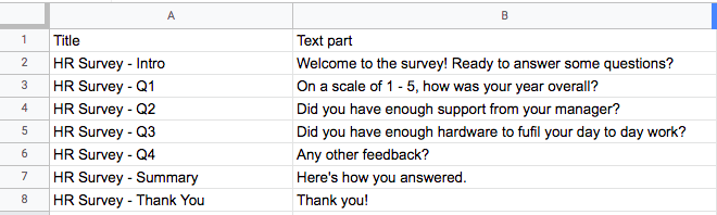 First create a CSV of your messages. The CSV file must contain the title of the message in a column named 'title' and then the text part in another column named 'text part'. For example: