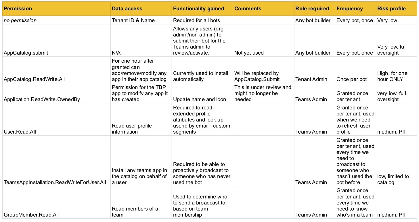 When connecting a bot to Teams, certain permissions are required to make specific functionality work. The table below outlines each permission potentially required, as well as the data access, functionality gained, role required to grant the permission, frequency and risk profile. You can use this information to decide which permissions best suit your project when connecting up your bot to Teams.