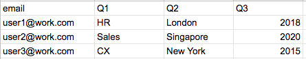 The CSV file must contain the email address in a column named ‘email’ and then any attributes to update thereafter. You can even add your values at this point, in each column under the corresponding attribute. Here's a couple of examples.